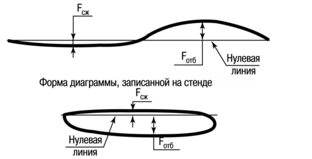 Пример анализа стойки амортизатора на стенде (неразборные задние): сверху эталонные значения, снизу результат действий стенда на снятую стойку