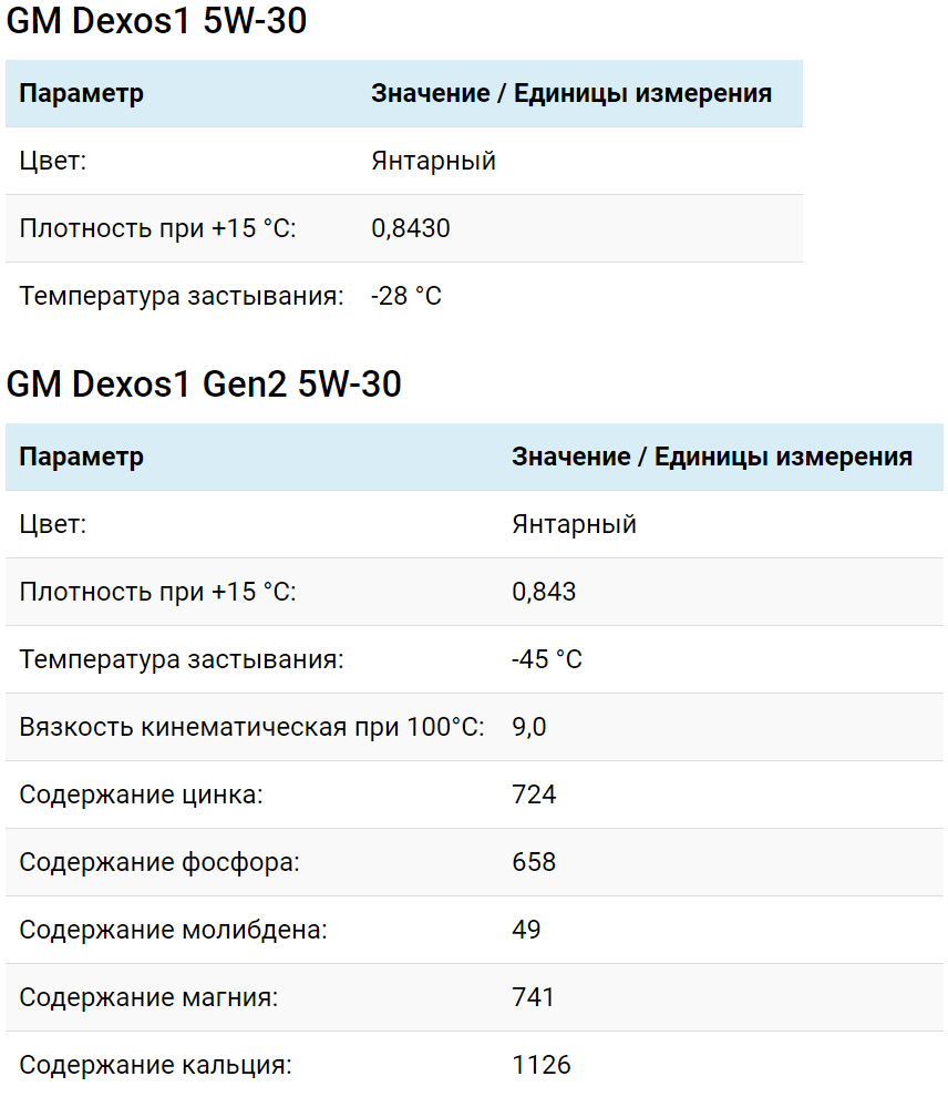 Основные технические характеристики GM Dexos 1 5W-30 и GM Dexos 1 Gen 2 5W-30 представлены в таблице.