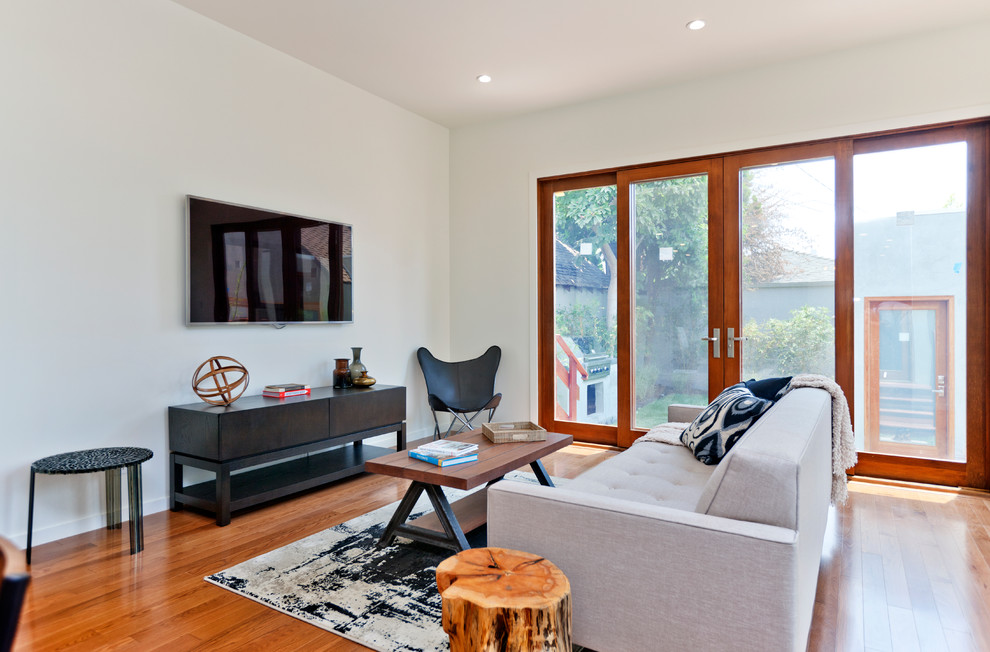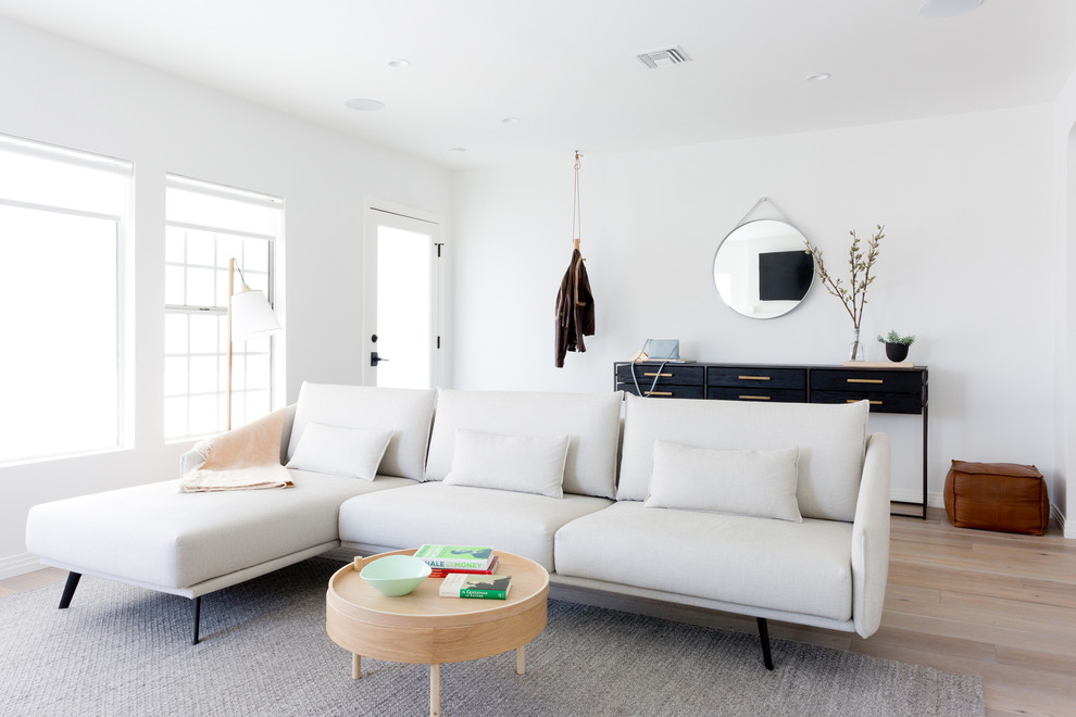 Светлый столик в стиле минимализм сливается с цветовой гаммой интерьера гостиной
