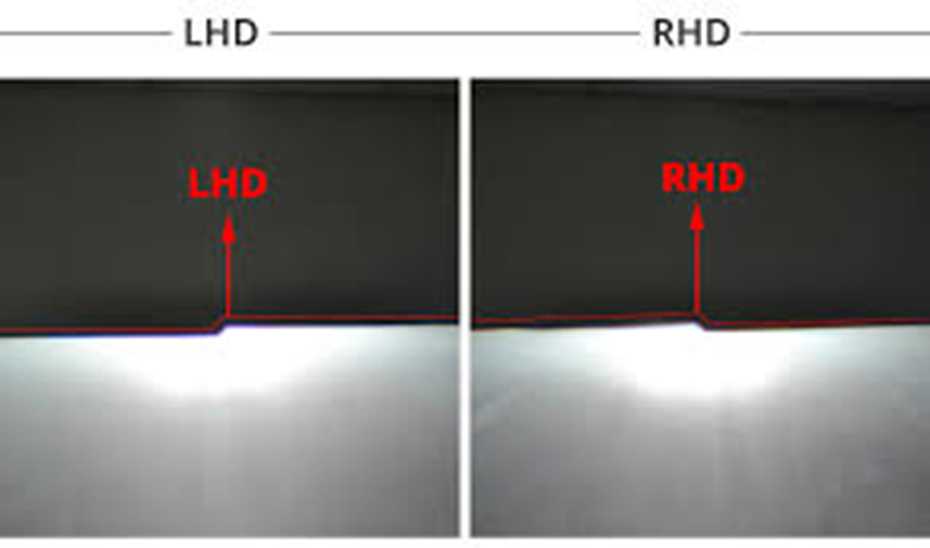 In Europe, headlamps approved for use on one side of the road must be adaptable to produce adequate illumination with controlled glare for temporarily driving on the other side of the road. And our projector lens produces an asymmetrical light suitable for use on only one side of the road. Low beam headlamps in LHT jurisdictions throw most of their light forward-leftward; those for RHT throw most of their light forward-rightward, thus illuminating obstacles and road signs while minimizing glare for oncoming traffic.
