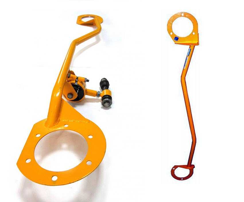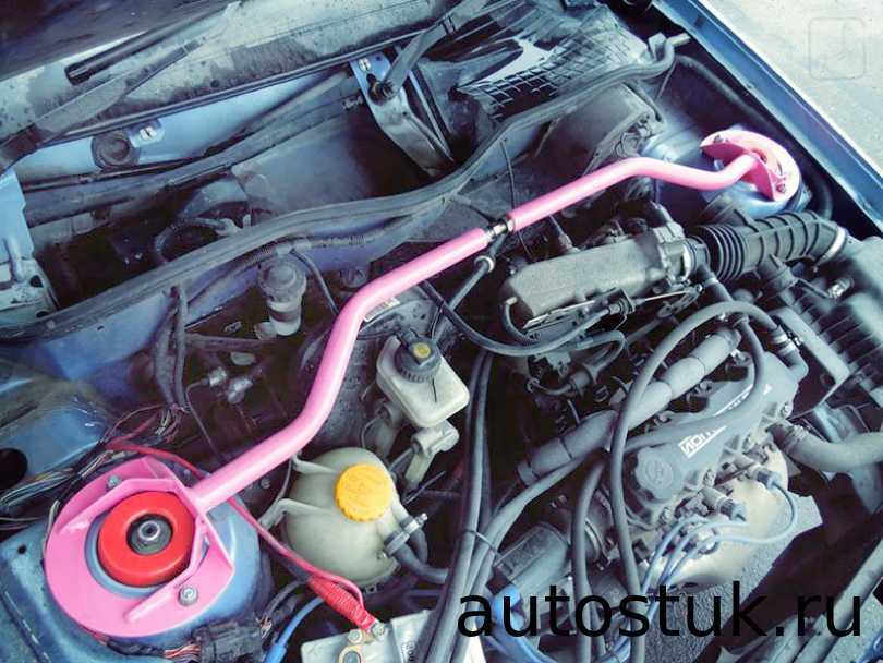 Между верхними опорами передних стоек в конструкции автомобиля монтируют распорку. Она придает дополнительную жесткость. По конструктивной особенности растяжка представляет собой трубу из металла с фланцами на концах. На фланцах делают отверстия равные диаметру шпилек стаканов стоек.