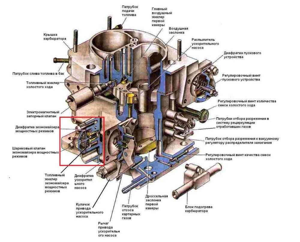 Чтобы понимать, как работает экономайзер и для чего он вообще может быть нужен, необходимо уточнить устройство самого карбюратора: