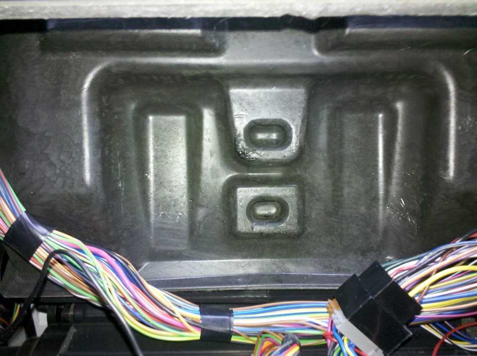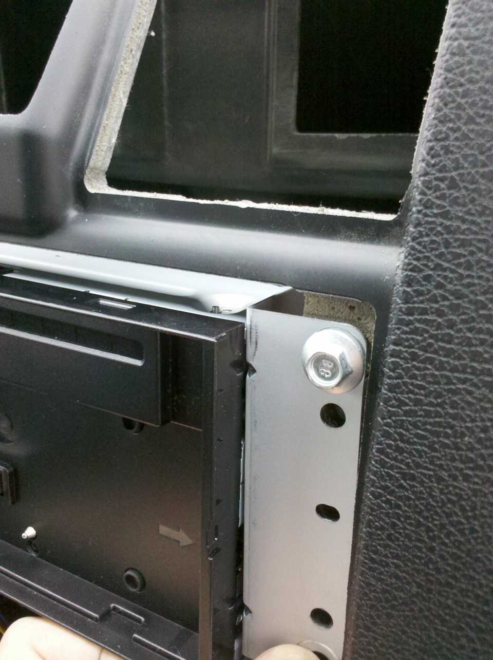 Как видно, по сравнению со штатной нужно было поднять уголки относительно магнитолы и сильней задвинуть их вглубь. Использовал я 2 разных отверстия, не в одной плоскости, чтобы не портить штатные отверстия (иначе одно пришлось бы сложно рассверливать, оно было очень близко к месту новой дырки).