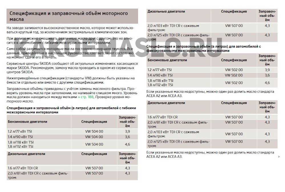 Для бензиновых и дизельных двигателей существуют параметры допуска, вязкости и зольности. Рассмотрим их отдельно для каждого модельного ряда Skoda Yeti: