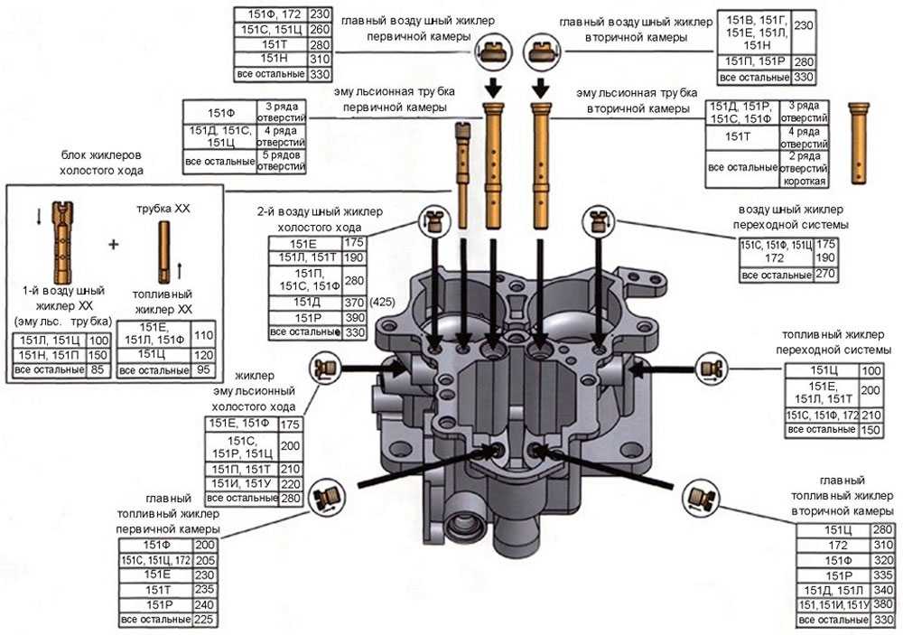 Дальнейший разбор К-151 подразумевает под собой демонтаж воздушных и топливных жиклеров, блока холостого хода, ускорительного насоса и выворачивания винтов качества. Полностью разбирать карбюратор нужно в момент проведения его комплексной промывки. Большинство автомехаников предпочитают полностью заменять жиклеры новыми экземплярами. Для этих целей можно воспользоваться таблицей жиклеров. Но, стоит сказать, что выходят из строя они лишь в исключительных случаях. Зачастую хватает их промывки и продувки для восстановления прежних функциональных свойств.