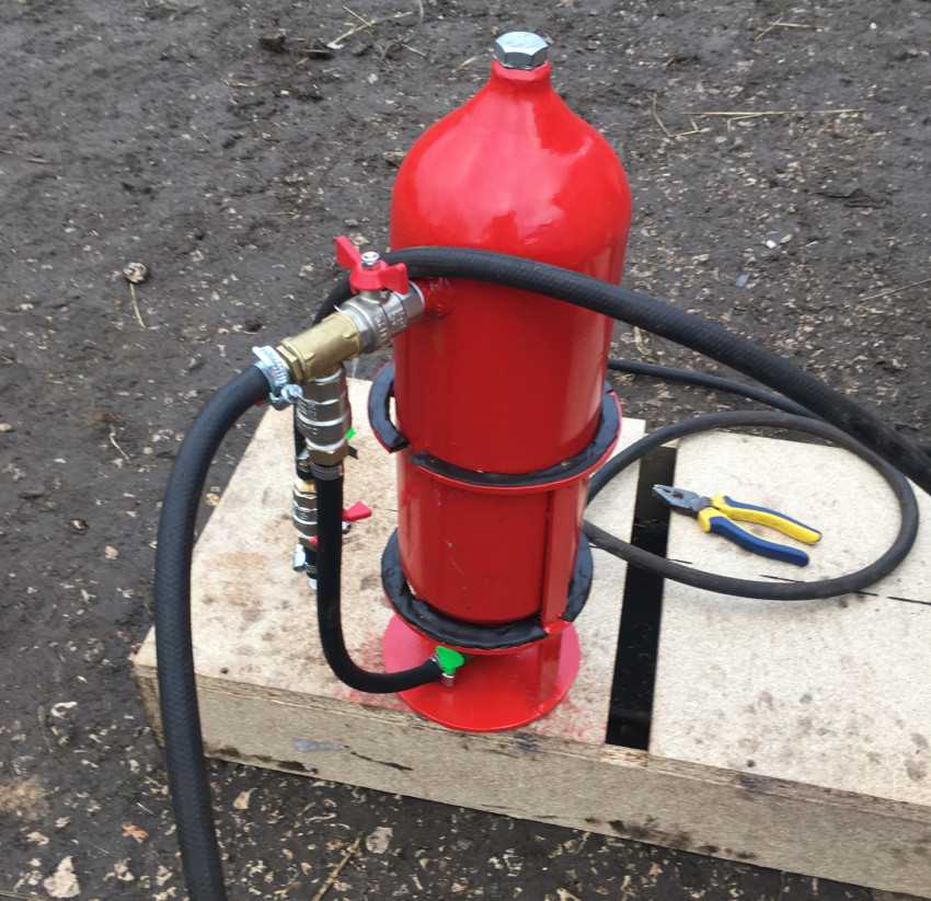 Как и в конструкции из газового баллона, потребуется в днище огнетушителя проделать отверстие для засыпки песка. Потом к выполненному отверстию прикрепляется резьбовой фитинг. Для придания устойчивости конструкции рекомендуют приварить к баллону металлические ножки. Этот прием также поможет обеспечить подключение шланга снизу.