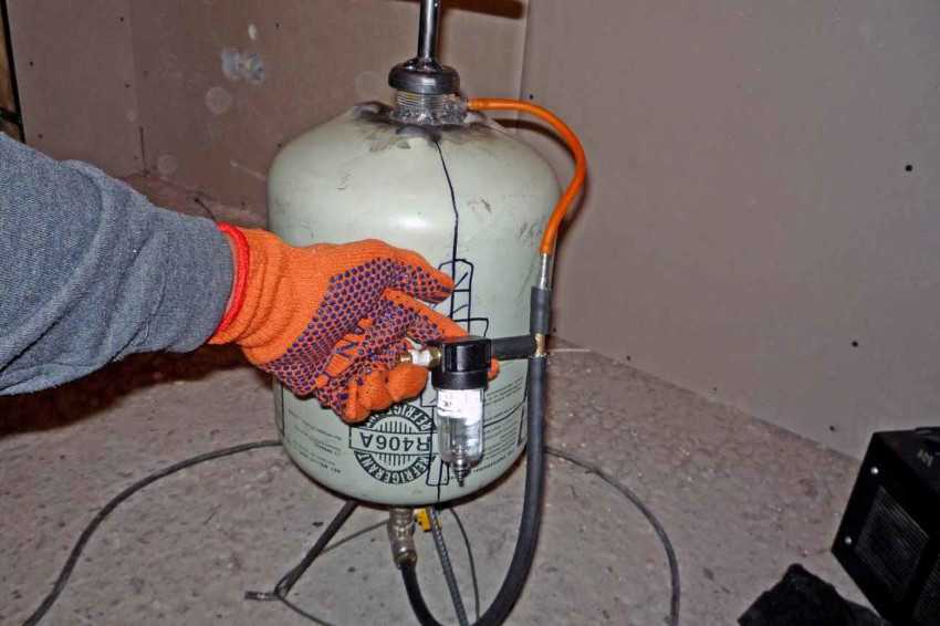 После того как подготовлены все детали, необходимые для изготовления, приступают непосредственно к сборке. Для начала требуется полностью освободить баллон от газа. Для этого следует открутить вентиль и ждать, пока газ полностью выйдет. Нужно быть предельно внимательным, потому как если этот этап проигнорировать, то возможны неприятные последствия. Чтобы быть уверенным, что газ полностью вышел из баллона, рекомендуют вставить шланг, предварительно подключенный к компрессору. Затем проводится полное выкачивание газовой смеси.