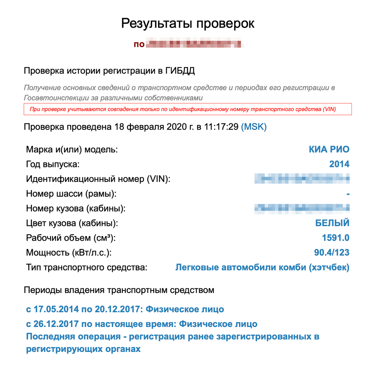 Результаты проверки с сайта ГИБДД — внизу указаны даты, когда автомобиль ставили и снимали с учета