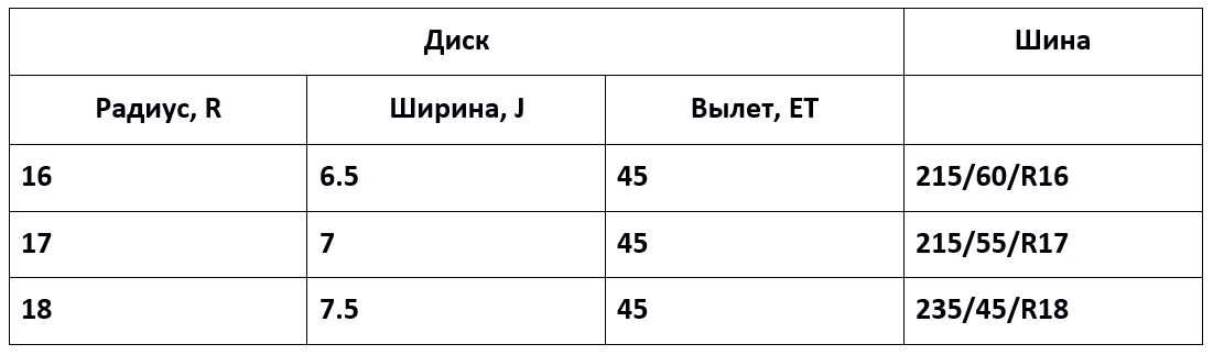 Использование рекомендованных типоразмеров покрышек позволит избежать проблем с управлением, безопасностью и иных трудностей. Какие нештатные размеры можно поставить? Руководствуйтесь данными по таблице, в ней указаны возможные допустимые альтернативные размеры для тюнинга. Хотя возможны и другие варианты, которые мы не описали в таблице. Например, диски пошире того же диаметра. Или поставить диски такой же ширины, но большего диаметра, что достаточно популярно среди автовладельцев. Выбор дисков огромен, вы можете найти экземпляры с такими же параметрами, но с величиной вылета на 1-2 миллиметра больше или меньше. Перечислить все варианты не представляется возможным.