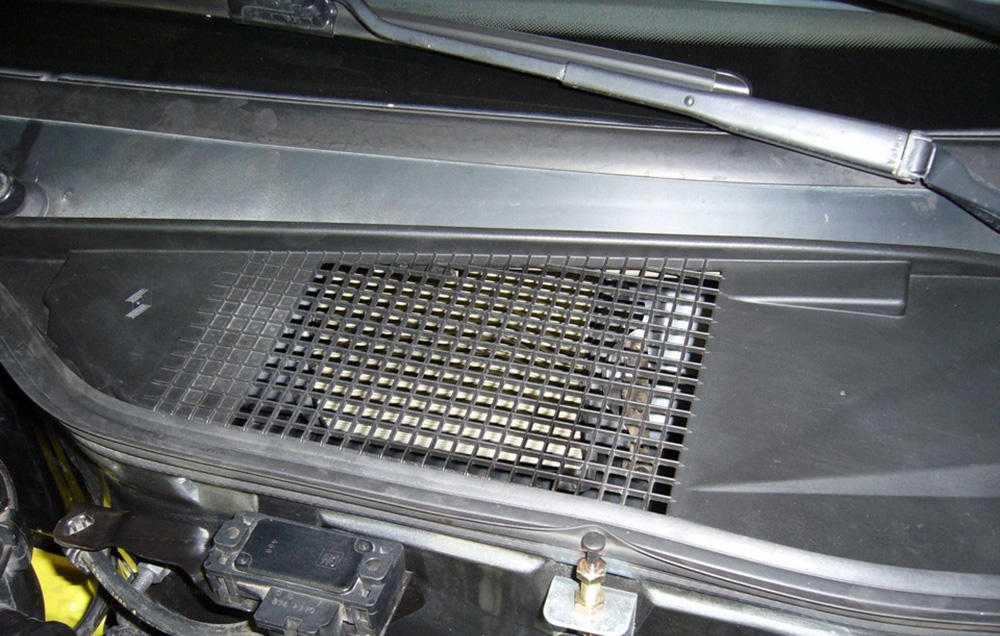 - Переходим в подкапотное пространство, где снимается решётка воздухозаборника. Для этого просто выкручивается 1 крепёж. Также откручивается вентилятор печки на 2 болтах. Если вы уверены, что проблема в радиаторе, вентилятор снимать не обязательно,