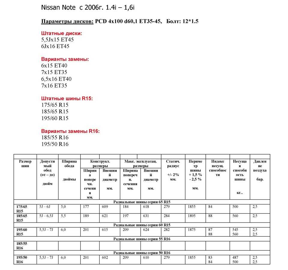 Спецификации дисков и размеры шин Nissan Note (2005 — 2008)