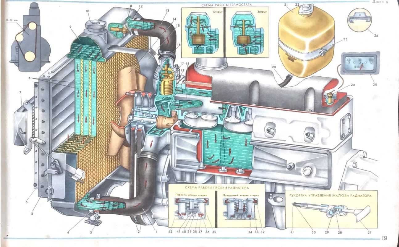 1. Выпускной шланг радиатора 2. Ремни вентилятора 3. Сливной краник радиатора 4. Выпускной патрубок радиатора 5. Жалюзи радиатора 6. Планка управления жалюзи 7. Масляный радиатор 8. Охлаждающие трубки радиатора 9. Верхний бачок радиатора 10. Пробка радиатора 11. Датчик контрольной лампы температуры охлаждающей жидкости 12. Впускной патрубок радиатора 13. Впускной шланг- радиатора 14. Вентилятор 15, Кожух вентилятора 16. Выпускной патрубок рубашки 17. Термостат 18. Насос охлаждающей жидкости 19. Трубка распределения охлаждающей жидкости 20. Трубка расширительного бачка 21. Расширительный бачок 22. Пробка расширительного бачка 23. Хомут 24. Датчик температуры охлаждающей жидкости 25. Указатель температуры охлаждающей жидкости 26. Клапан пробки расширительного бачка 27. Рукоятка тяги управления жалюзи 28. Шарик, фиксирующий положение, рукоятки 29. Пружина шарика 30. Оболочка тяги управления жалюзи 31. Тяга управления жалюзи 32. Корпус пробки радиатора 33. Прокладка пробки радиатора 34. Пружина пробки радиатора 35. Наливная горловина радиатора 36. Пружина выпускного клапана 37. Прокладка выпускного клапана 38. Выпускной клапан 39. Впускной клапан 40. Пружина впускного клапана 41. Прокладка впускного клапана 42. Патрубок трубки расширительного бачка