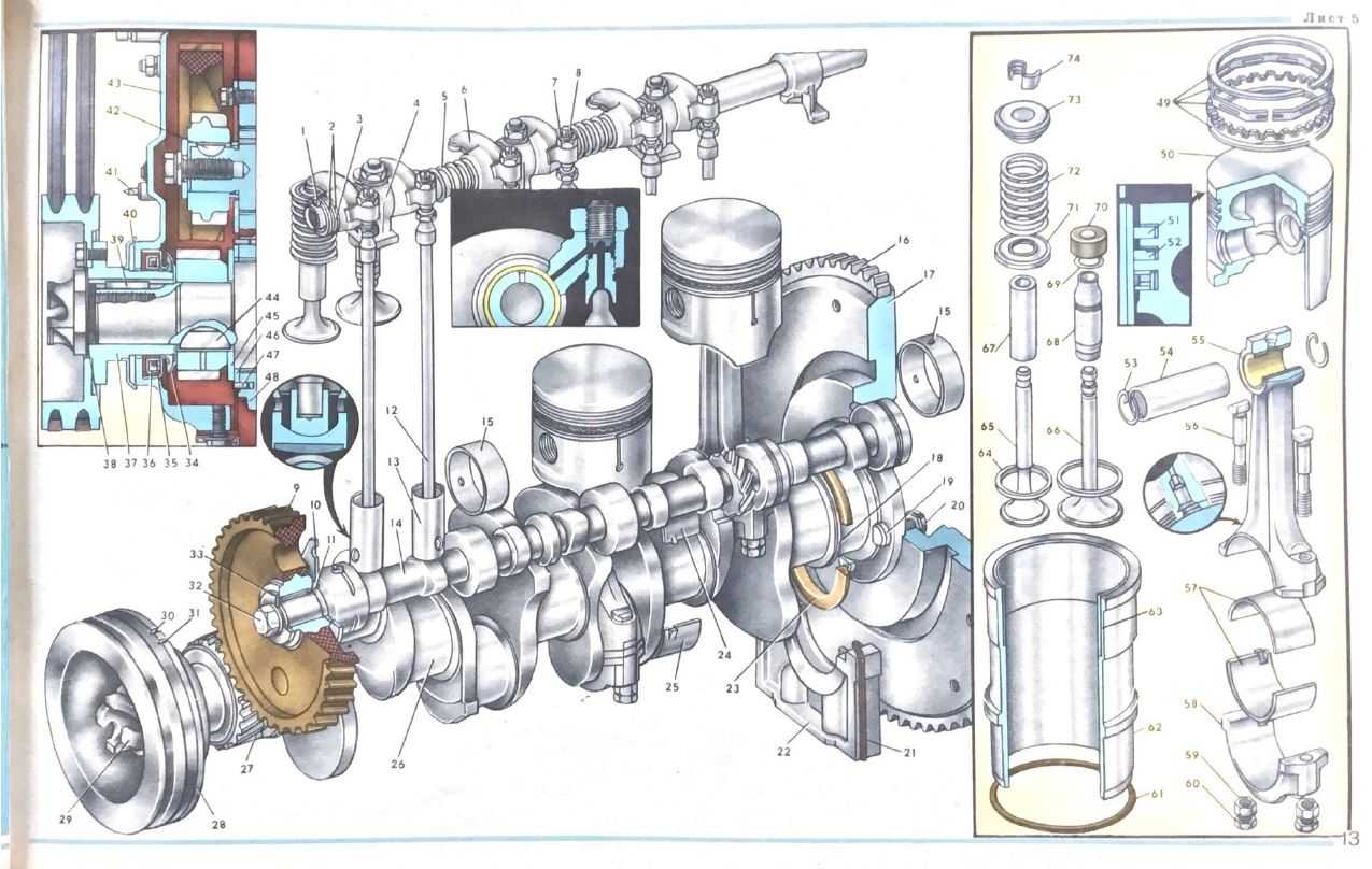 1. Шплинт оси коромысел 2. Плоские шайбы оси коромысел 3. Пружинная шайба осн коромысел 4. Стойка оси коромысел 5. Распорная пружина коромысел 6. Коромысло клапана 7. Контргайка винта perулировочного клапана 8. Регулировочный винт клапана 9. Шестерня 10. Упорный фланец распределительного вала 11. Распорное кольцо распределительного вала 12. Штанга толкателя 13. Толкатель клапана распределительного вала 14. Распределительный вал 15. Втулки распределительного вала 16. Зубчатый обод маховика 17. Маховик 18. Маслоотражательный гребень коленчато вала 19. Болт крепления маховика 20. Гайка болта крепления маховика 21. Уплотнительная прокладка 22. Держатель сальника заднего подшипника 23. Набивка сальника заднего подшипника 24. Верхний вкладыш коренного подшипника 25. Нижний вкладыш коренного подшипника 26. Коленчатый вал 27. Распределительная шестерня 28. Шкив коленчатого вала 29. Храповик коленчатого вала 30. Метка для установки поршня в в. м. т. 31. Метка для установки зажигания 32. Болт крепления шестерни распределительного вала 33. Шайба шестерни распределительного вала 34. Маслоотражатель коленчатого пала 35. Маслоотражатель переднего 36. Передний сальник коленчатого вала сальника 37. Ступица шкива коленчатого вала 38. Зубчатая шайба храповика 39. Призматическая шпонка ступицы шкива 40. Отражатель крышки распределительных шестерен 41. Штифт установки зажигания 42. Сегментная шпонка шестерни распре- делительных шестерен 43. Крышка распределительных 44. Сегментная шестерен распределительной шестерни 45. Упорная шайба коленчатого вала 46. Передняя шайба упорного подшипника 47. Штифт передней шайбы упорного подшипника 48. Крышка переднего коренного подшипника 49. Маслосъемное кольцо (составное) 50. Поршень 51. Верхнее компрессионное кольцо 52. Нижнее компрессионное кольцо 53. Стопорное кольцо поршневого пальца 54. Поршневой палец 55. Шатун 56. Болт шатуна 57. Вкладыши шатуна 58. Крышка шатуна 59. Гайка болта шатуна 60. Контргайка болта шатуна 61. Прокладка гильзы цилиндра 62. Гильза цилиндра 63. Вставка гильзы цилиндра 64. Седло клапана 65. Выпускной клапан 66. Впускной клапан 67. Втулка выпускного клапана 68. Втулка впускного клапана 69. Стопорное кольцо втулки впускного клапана 70. Маслоотражательный колпачок 71. Опорная шайба пружины клапана 72. Пружина клапана 73. Тарелка пружины клапана 74. Сухарь клапана