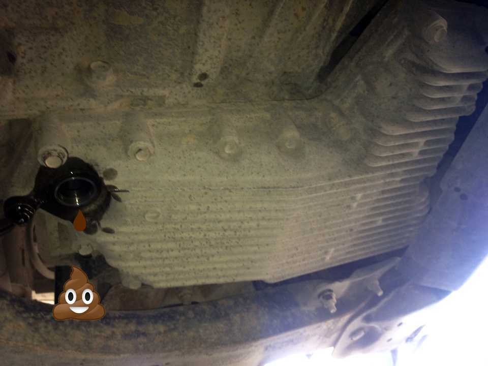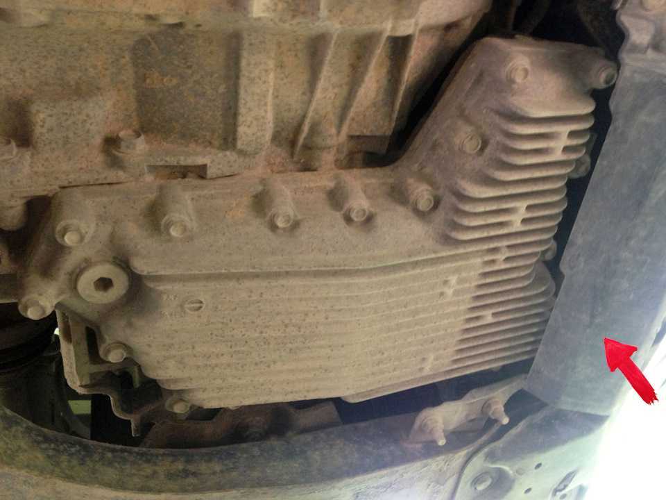 Приступим. Залезаем в яму, находим поддон и видим, что для охлаждения поддона с горячим маслом установлен дефлектор