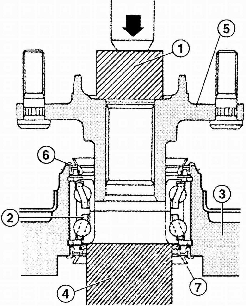Рис. 5.11. Запрессовка ступицы в поворотный кулак: 1 — оправка; 2 — подшипник ступицы колеса; 3 — поворотный кулак; 4 — подставка; 5 — ступица колеса; 6 — наружная манжета; 7 — внутренняя манжета |