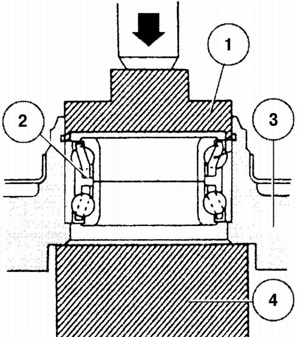 Рис. 5.10. Запрессовка подшипника в поворотный кулак: 1 — оправка; 2 — подшипник ступицы колеса; 3 — поворотный кулак; 4 — подставка |