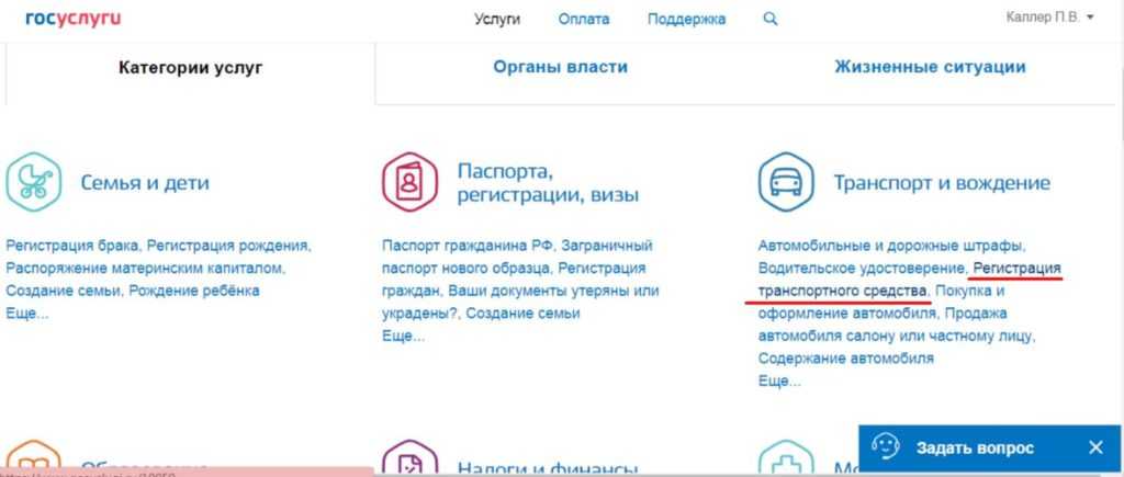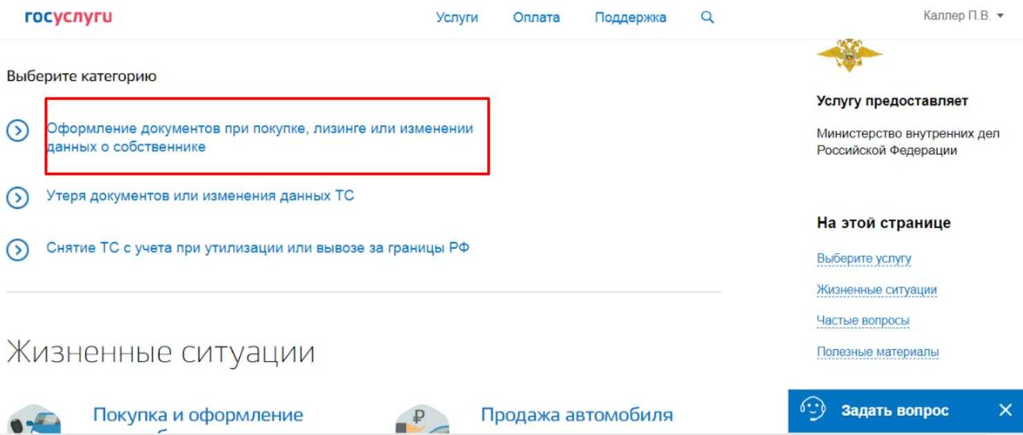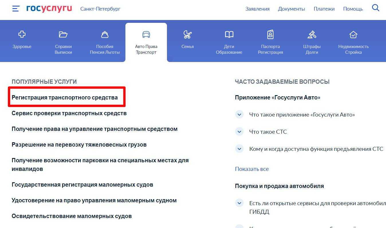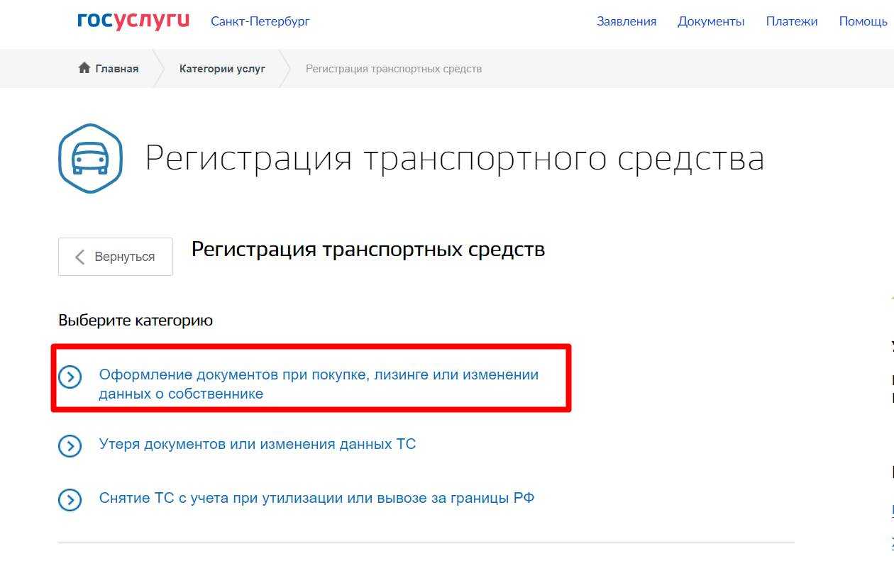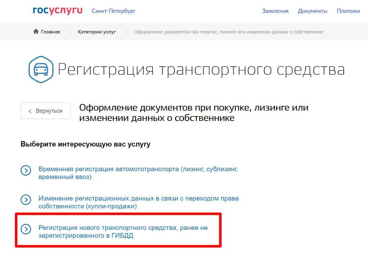 Перейти в каталог услуг и выбрать раздел, связанный с постановкой на учет машины.