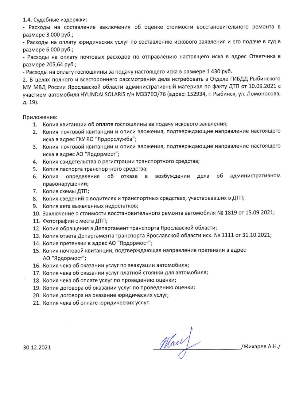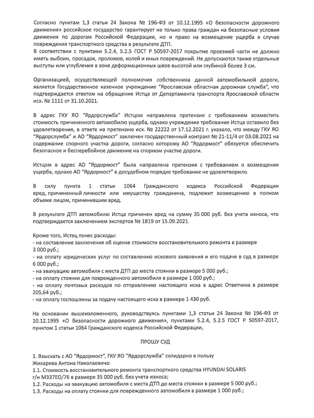 Успех в деле будет зависеть от мотивировочной части, в которой необходимо прописать доказательства причинения ущерба и вину конкретной дорожной организации. В ход, к слову, могут идти любые подтверждения, большинство из них просто обязано присутствовать вместе с иском: