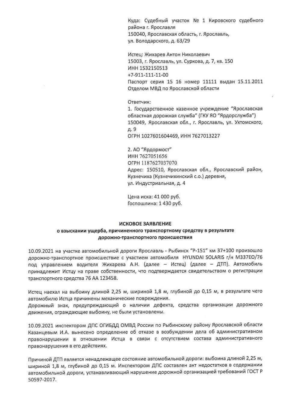 Если собственник дороги и подрядчик оставят претензию без ответа — нужно подавать исковое заявление в суд. Вот как это сделать: