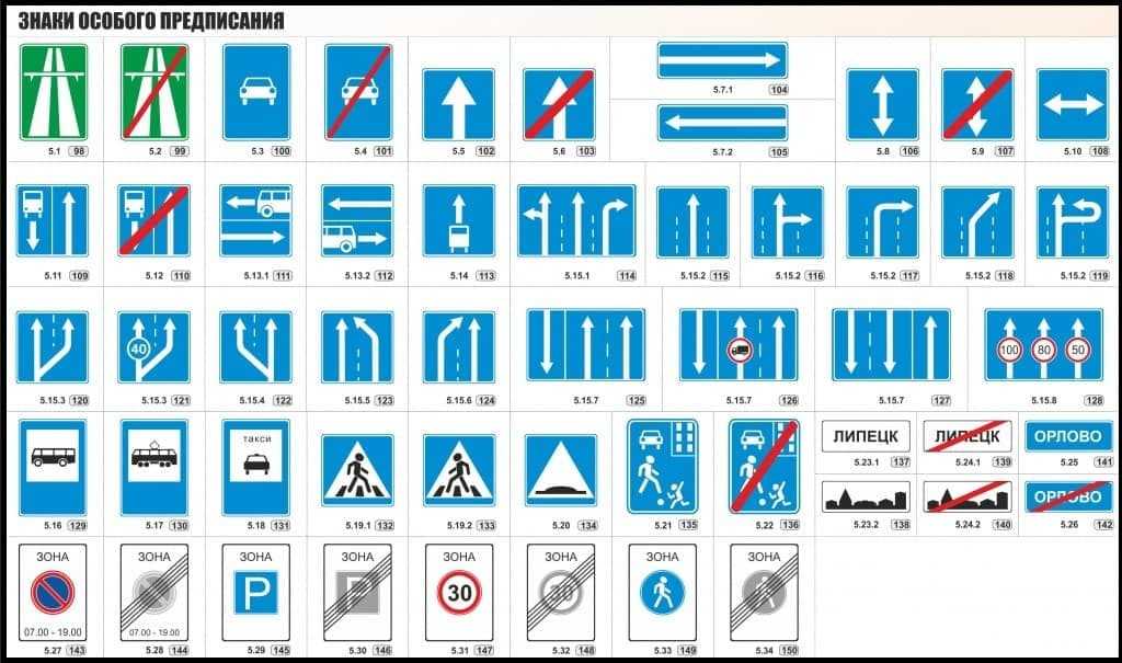| Особых предписаний | Устанавливают направления движений по полосам, места остановок транспорта и пешеходных переходов, извещают о населённых пунктах, указывают на парковочные, жилые, пешеходные зоны и зоны с ограничениями скорости или остановки. | Синий прямоугольник с белой картинкой внутри | «Одностороннее движение», «Реверс», «Полоса для маршрутных ТС», «Остановка», «Пешеходный переход», «Парковочная зона». |
