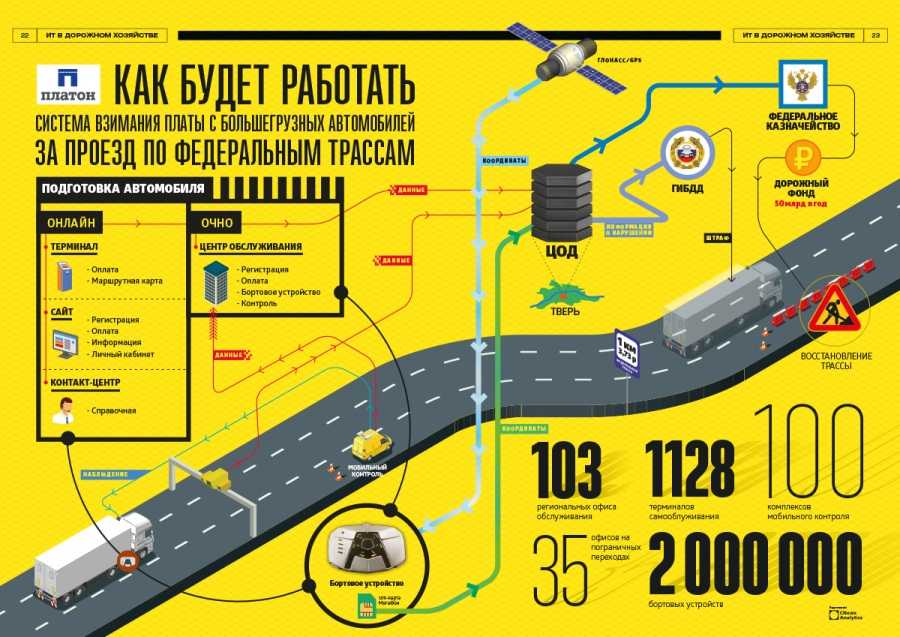 Год назад в России начала действовать система взимания платы за проезд по федеральным трассам грузовиков с разрешенной максимальной массой более 12 тонн «Платон». Платить должны как российские большегрузы, так и иностранные логистические компании. Пройденное расстояние фиксируется с помощью специальных бортовых устройств БУ 1201, оборудованных системами GPS и ГЛОНАСС, либо при помощи маршрутной карты. Наличие системы отслеживается при прохождении фуры через специальные стационарные рамки на дорогах, либо мобильными комплексами — специально оборудованными автомобилями.