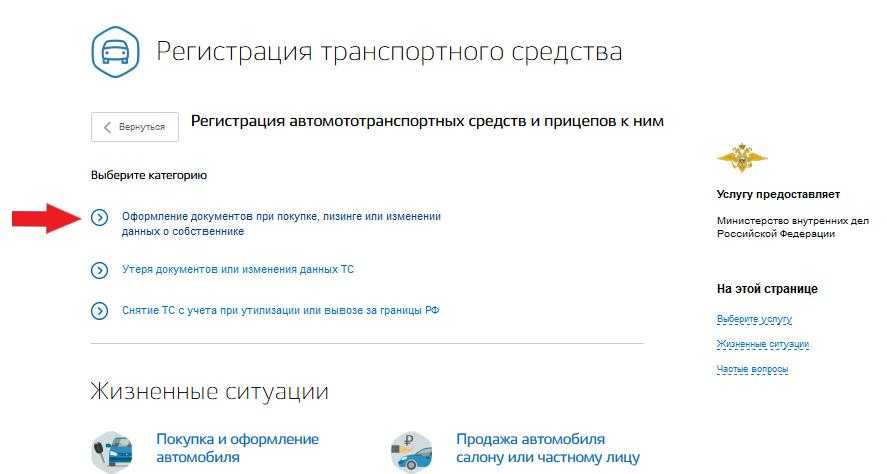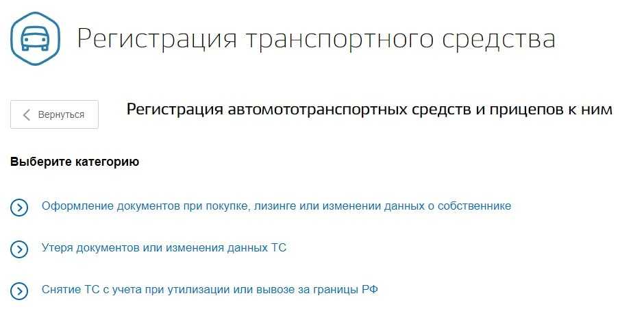Дальше, в зависимости от обстоятельств, кликаем на наиболее подходящий пункт. Если постановка прицепа на учет связана со сменой собственника или покупкой, выбираем первый пункт.