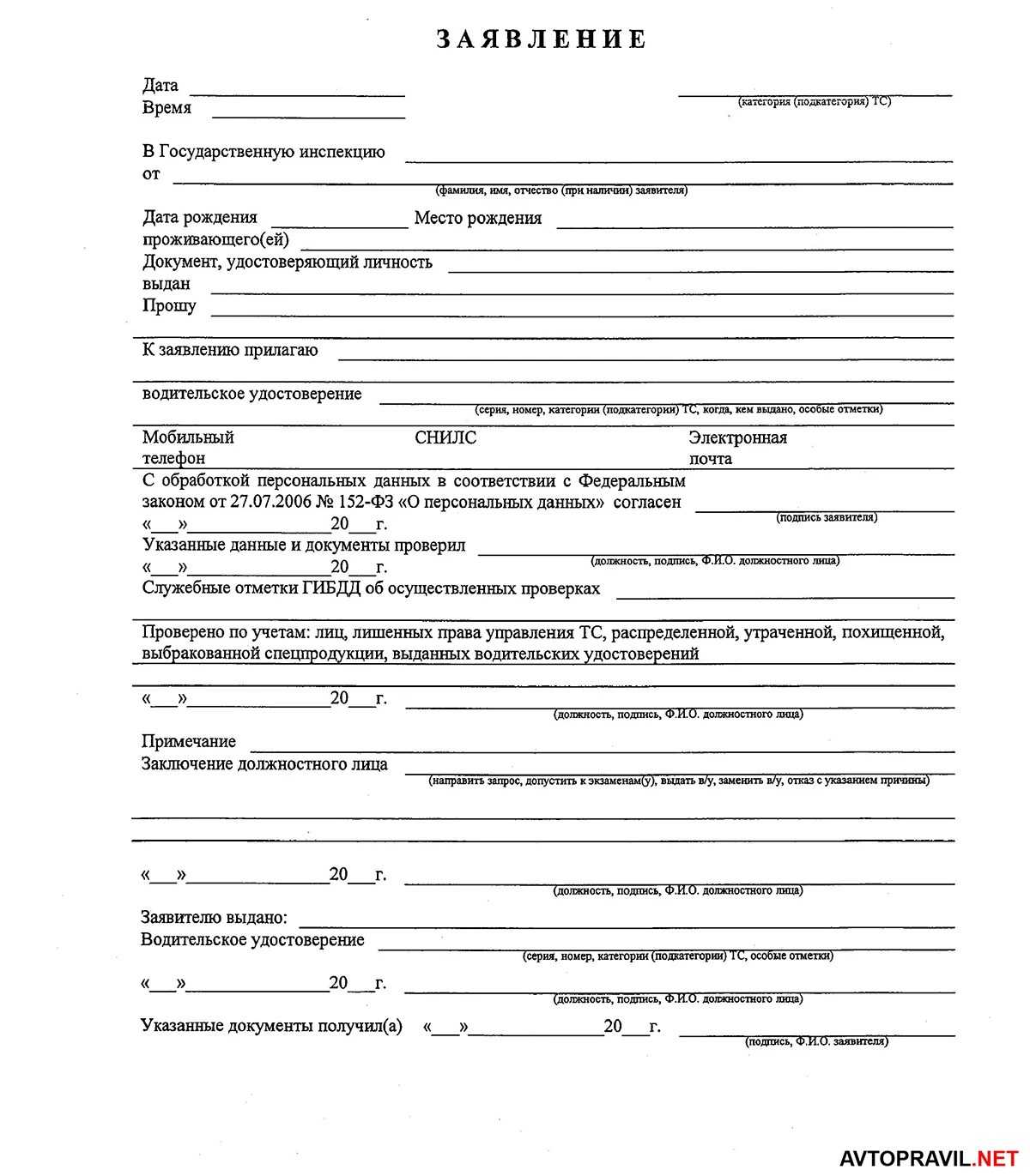 - Заявление о том, что ВУ было утеряно. Его можно заполнить прямо на месте подачи документов.