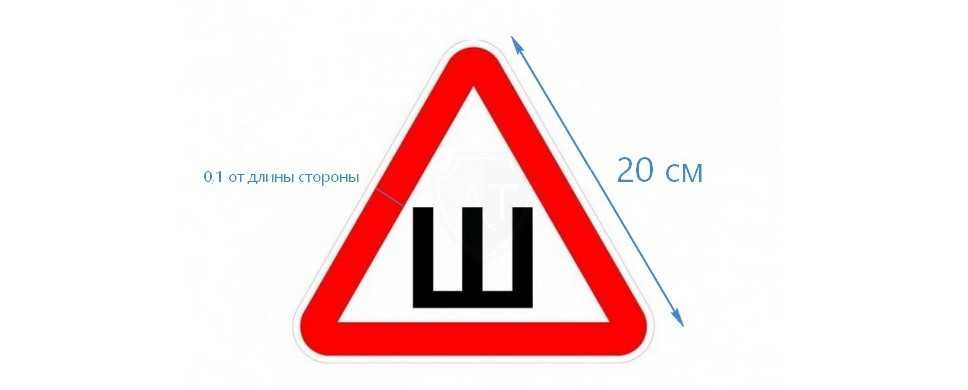 Пресловутый пункт 8 в «Основных положениях» обозначает и размер знака «Шипы»: он должен являть собой равносторонний треугольник белого цвета с основанием не менее 200 мм и каймой красного цвета, ширина которой должна составлять 1/10 от стороны. В кайму должна быть вписана черная буква «Ш». Максимальные размеры знака могут быть любыми. Но даже самый маленький вариант все равно выходит довольно крупным.