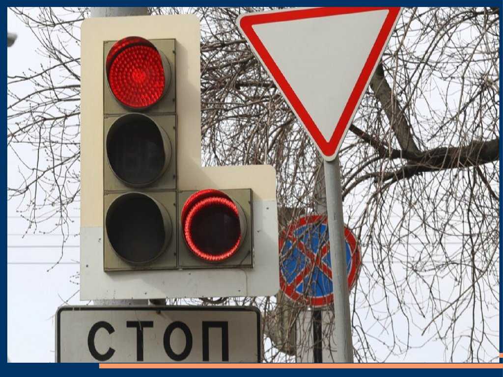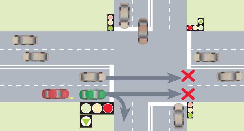 При проезде перекрестков со светофорами в первую очередь следует определить, какой из сигналов светофора соответствует нужному направлению.