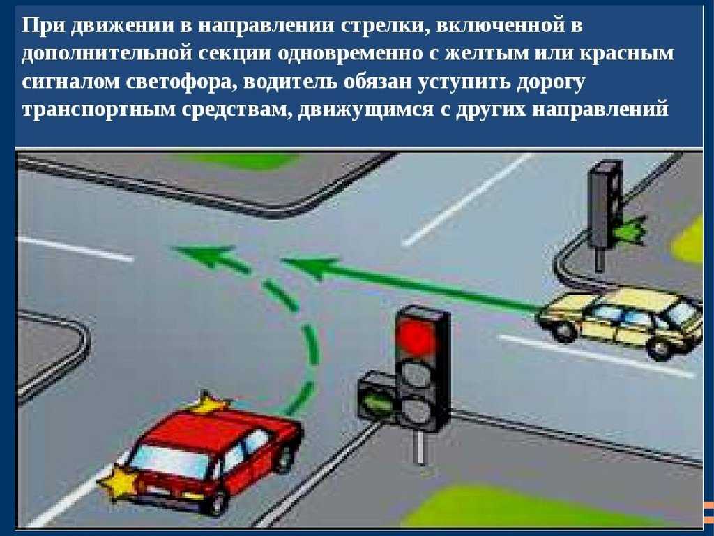Ехать прямо можно, когда светится зеленый сигнал в главном табло самостоятельно или с добавочной стрелкой. Если центральный сигнал красный, но боковая стрелка зеленая, ехать прямо нельзя. В ситуации, когда боковая стрелка неактивна, то нужно ориентироваться на сигнал основного табло.