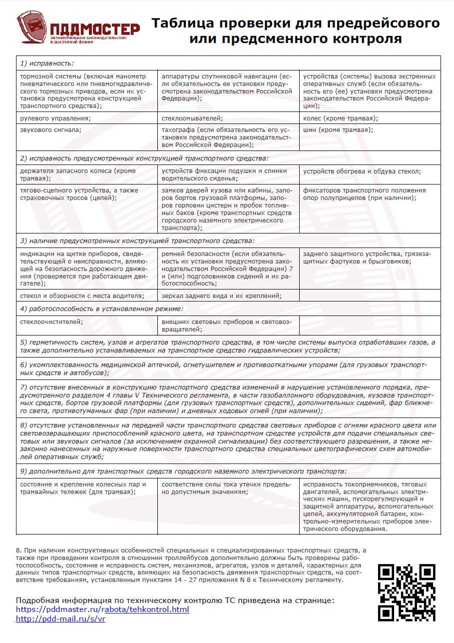 Процедура предсменного осмотра включает полный список проверяемых деталей (нажмите на изображение, чтобы увеличить его):