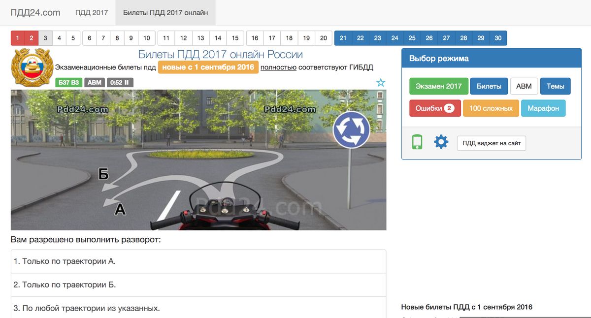 На сайте ПДД-24 есть можно проходить вопросы по билетам, по темам, выбрать 100 самых сложных или пройти марафон — все билеты до первой ошибки