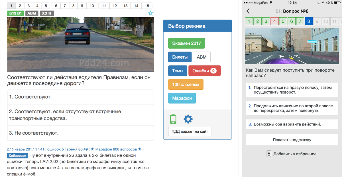 Удобнее всего проходить вопросы на сайте ПДД-24 или в приложении «Экзамен ПДД 2017»