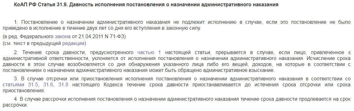 Многие водители, решая, как вести себя в ситуации, которая угрожает им лишением прав, в первую очередь обращают внимание на статью 31.9 КоАП РФ. Согласно ей, срок давности для исполнения наказания по административному нарушению составляет 2 года
