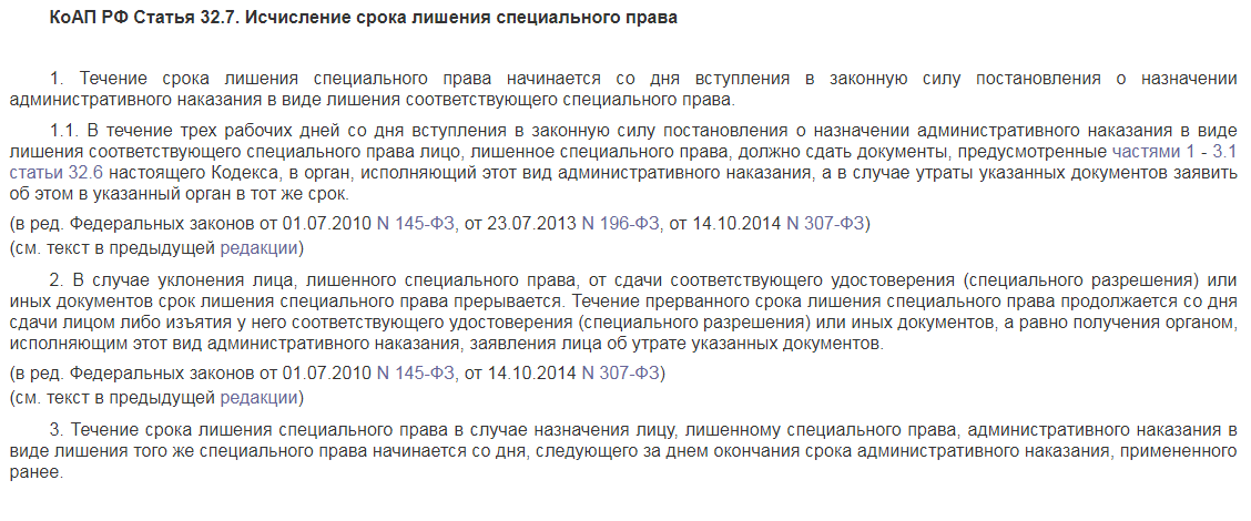 Информация, которая обосновывает эти особенности истечения срока лишения прав содержится в следующих статьях КоАП РФ: