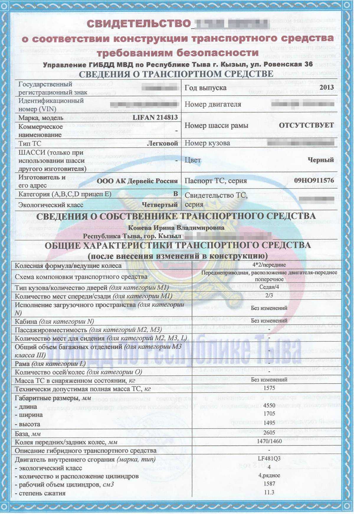 В результате мне заменили свидетельство о регистрации автомобиля, внесли изменения в ПТС и выдали документ о том, что конструкция автомобиля соответствует требованиям безопасности.