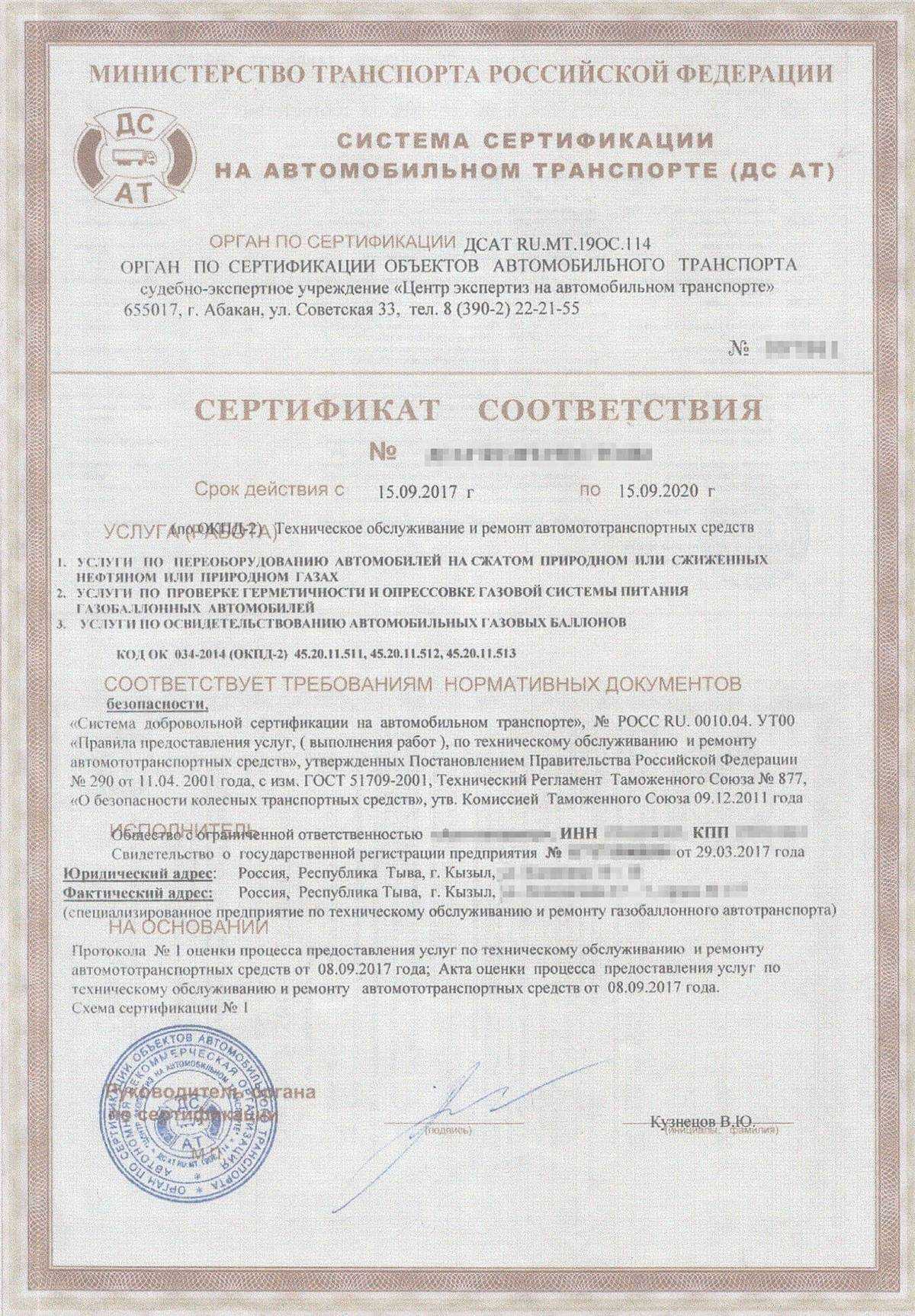 - заверенную (предприятием-изготовителем ГБО, поставщиком или продавцом) в установленном порядке копию сертификата соответствия на комплект ГБО, которое Вы оформляете, в отношении его установки на конкретный тип ТС с приложениями о составе комплекта, с указанием обозначения документации на комплектующие и их соответствие требованиям безопасности,