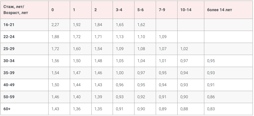 КВС учитывает возраст водителя (всего Центробанком установлено 8 возрастных групп), а также его стаж (всего 8 групп стажа). В том случае, если владелец авто – юридическое лицо, коэффициент индексируется на 1,8. Если водителей у одного транспортного средства несколько, при расчете стоимости ОСАГО применяется наибольший из рассчитанных для каждого из них КВС.